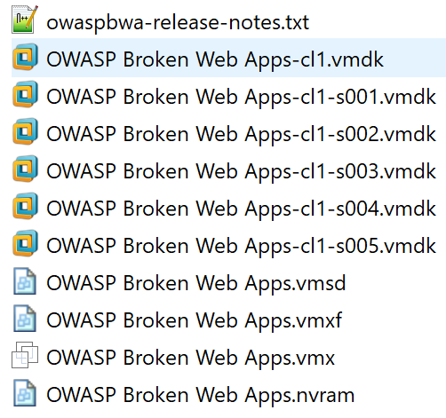 - All file extensions shown indicate the VM can be imported into Oracle VirtualBox or VMware Player/Workstation. For purposes of setting up the web application pentesting lab for this book, we will use Oracle VirtualBox.
