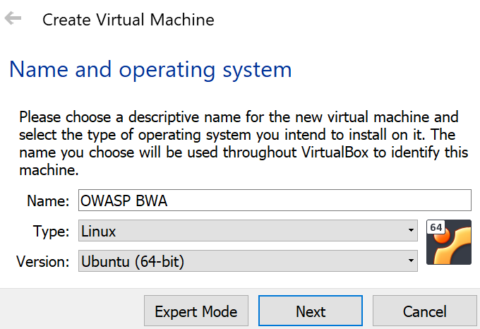 - Within the VirtualBox Manager screen, select Machine | New from the top menu and type a name for the machine, OWASP BWA.