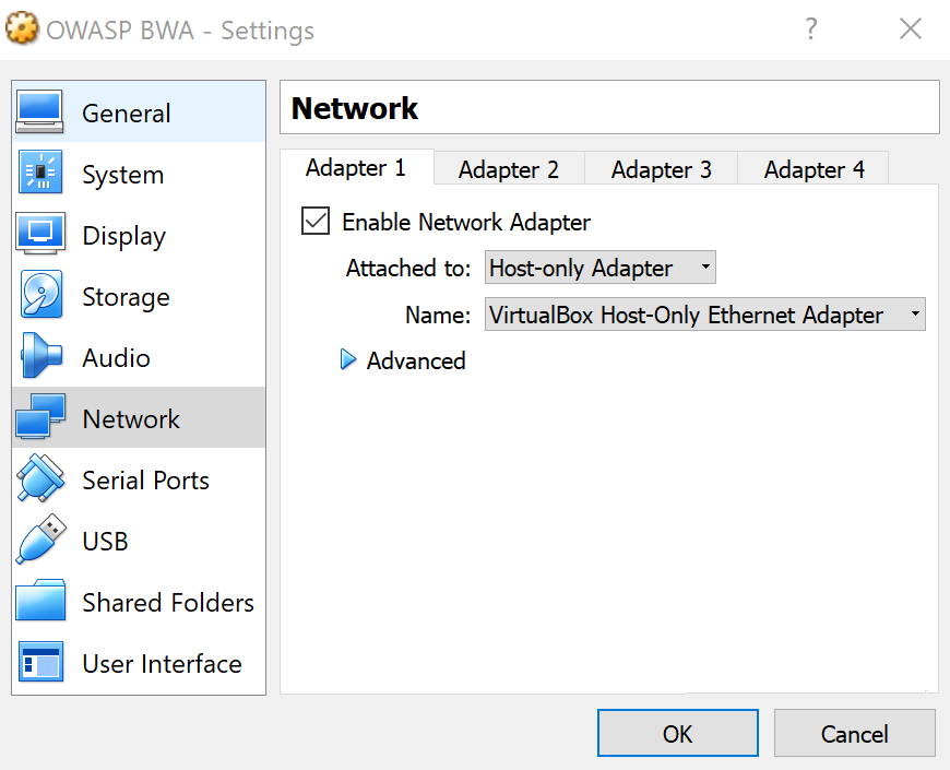 - Select the Network section in the left-hand pane and change to Host-only Adapter. Click OK.