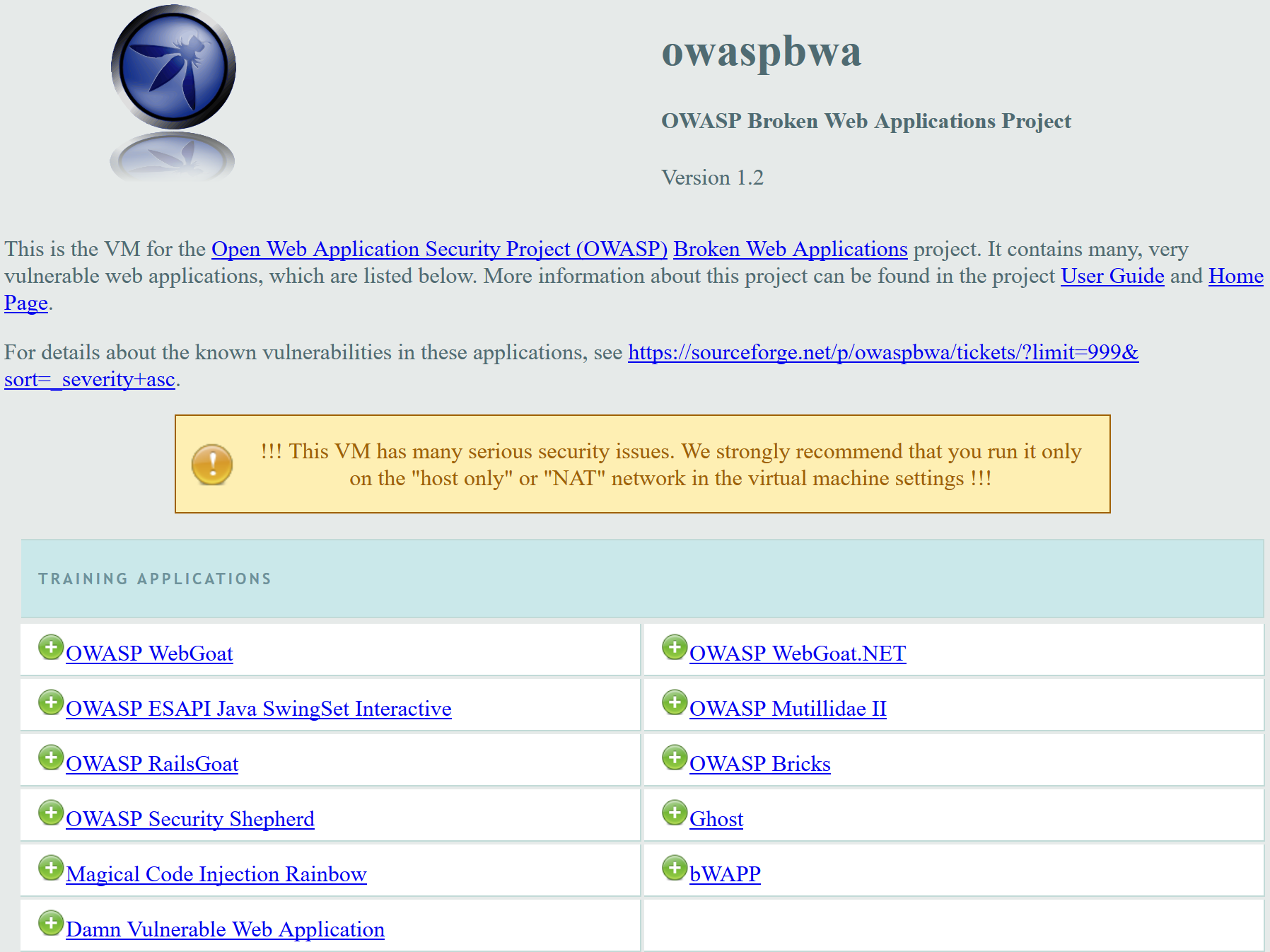 - In your browser, you are presented with an index page containing links to vulnerable web applications. These applications will be used as targets throughout this book: