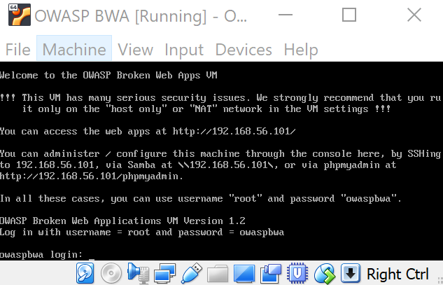 - The information presented on this screen identifies the URL where you can access vulnerable web applications running on the VM. For example, in the previous screenshot, the URL is http://192.168.56.101/. You are given a prompt for administering the VM, but it is not necessary to log in at this time.