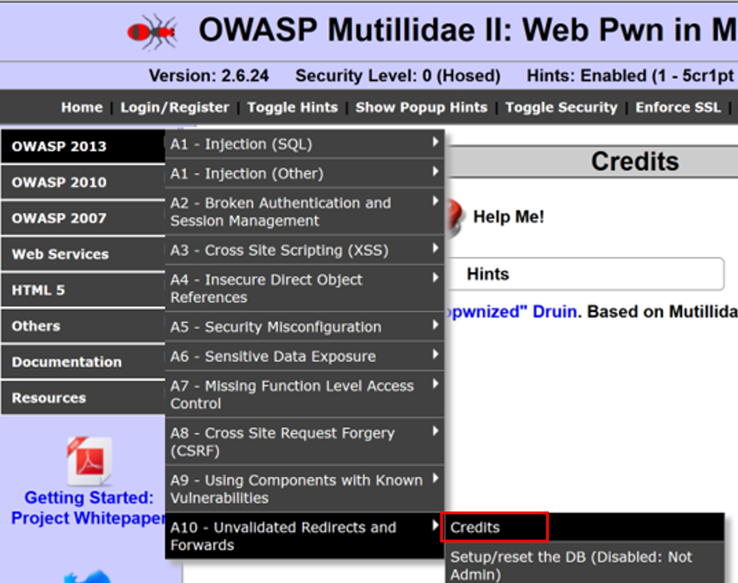 - Navigate to OWASP 2013 | A10 – Unvalidated Redirects and Forwards | Credits: