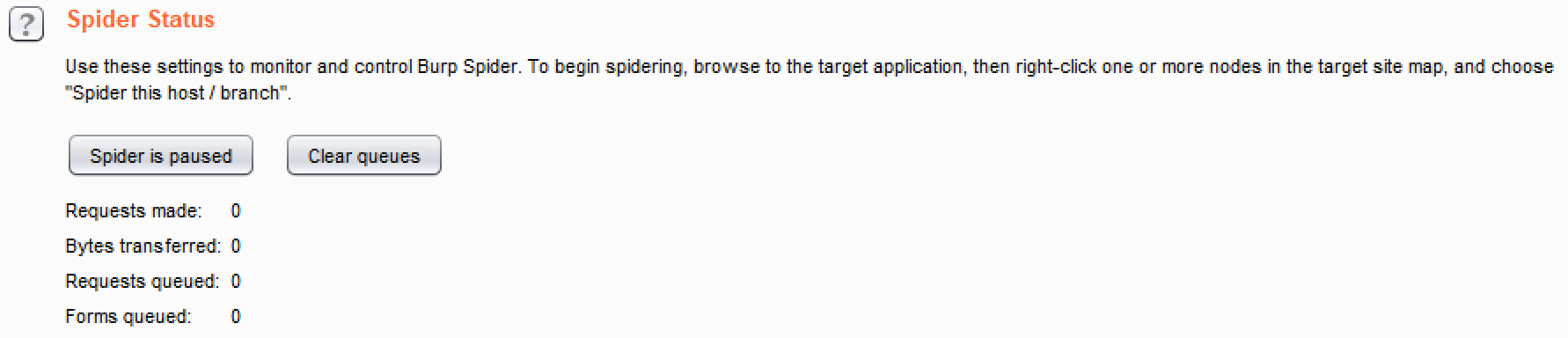 - Spider Status: It provides the ability to turn the spidering functionality on or off (paused). It also allows us to monitor queued-up Spider requests along with bytes transferred, and so on. This section allows any forms queued to be cleared by clicking the Clear queues button: