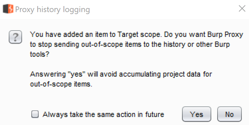 - Upon adding the folder mutillidae to your scope, you may be presented with a Proxy history logging dialog box, as follows. You may choose to avoid collecting messages out of your cope by clicking Yes. Or you may choose to continue to have the Proxy HTTP History table collect any messages passing through Burp, even if those messages fall outside the scope you've identified. For our purposes, we will select Yes: