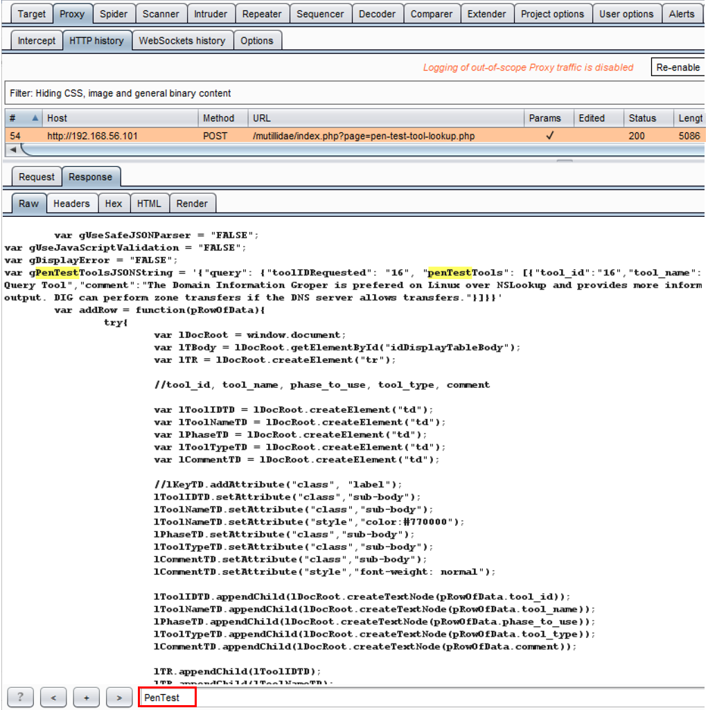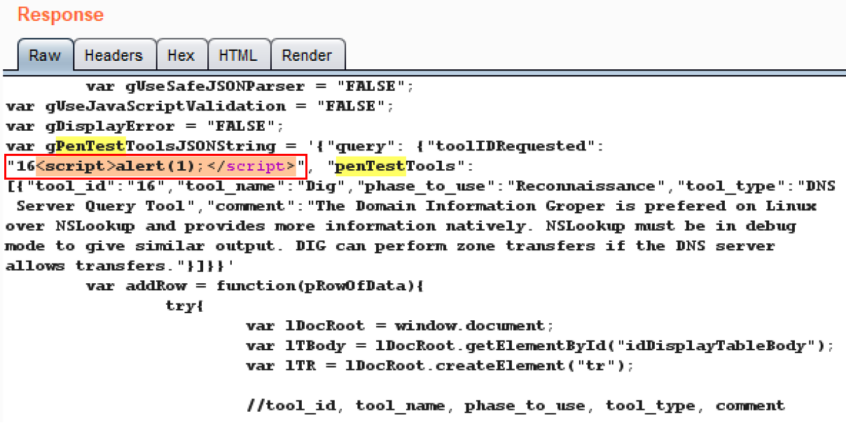 - Flip over to the Response tab and note the JSON returned from the request. You can find the JavaScript function in the response more easily by typing PenTest in the search box at the bottom. Note that the tool_id is reflected in a response parameter called toolIDRequested. This may be an attack vector for XSS: