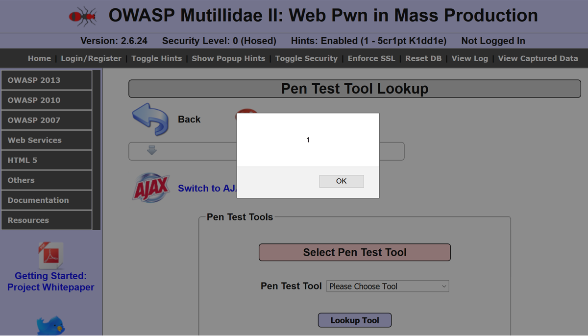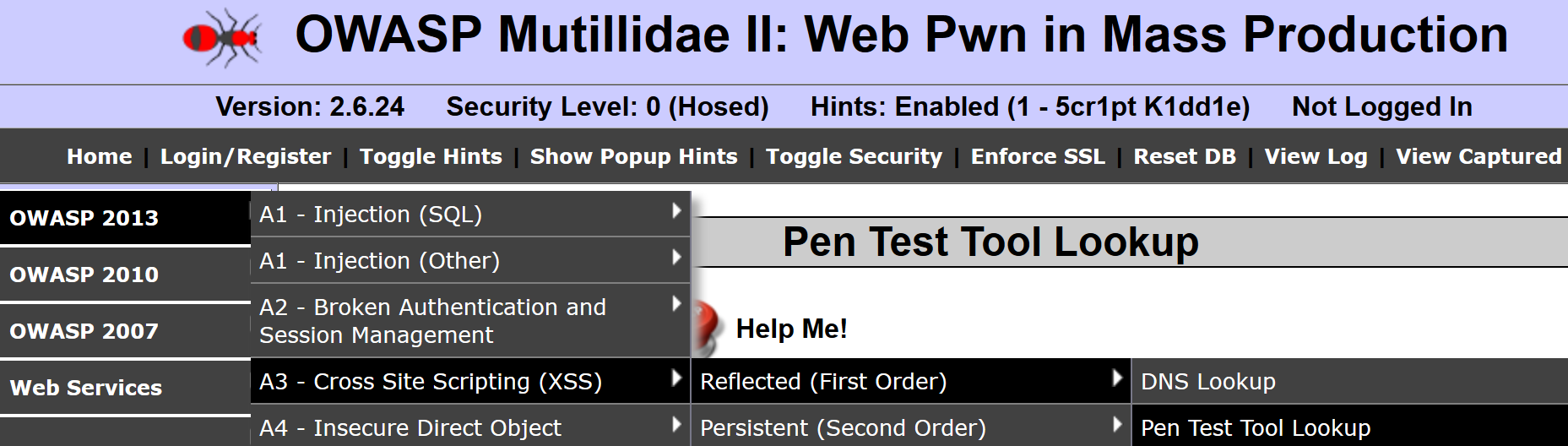 - From the OWASP Mutilliae II menu, select Login by navigating to OWASP 2013 | A3 - Cross Site Scripting (XSS) | Reflected (First Order) | Pen Test Tool Lookup:
