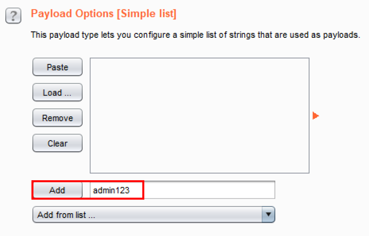 - In the Payload Options [Simple list] section, type the string admin123 and click the Add button: