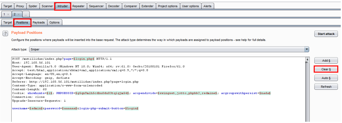 - Go to Burp's Intruder tab, and leave the Intruder | Target tab settings as it is. Continue to the Intruder | Positions tab and notice how Burp places payload markers around each parameter value found. However, we only need a payload marker around the password's value. Click the Clear § button to remove the payload markers placed by Burp:
