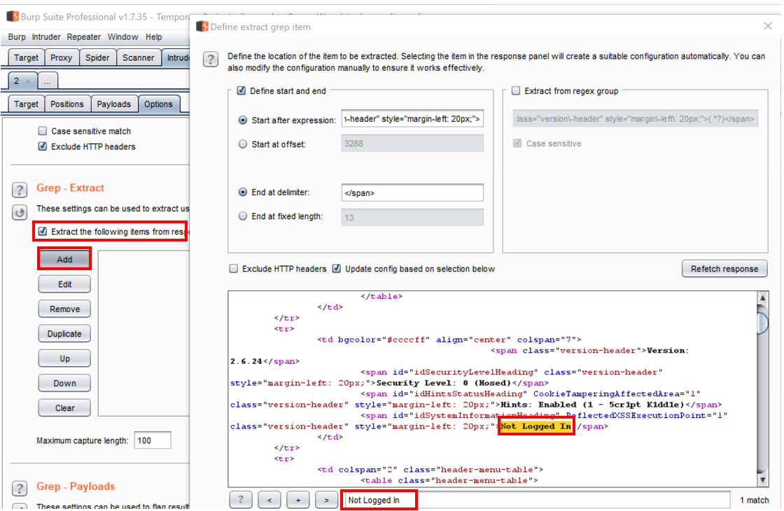 - Go to the Intruder | Options tab and scroll down to the Grep – Extract section: