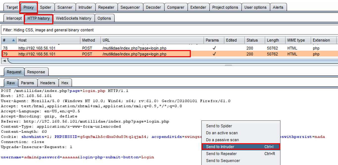 - Go to the Proxy | HTTP history tab, and look for the failed login attempts. Right-click one of the five requests and send it to Intruder: