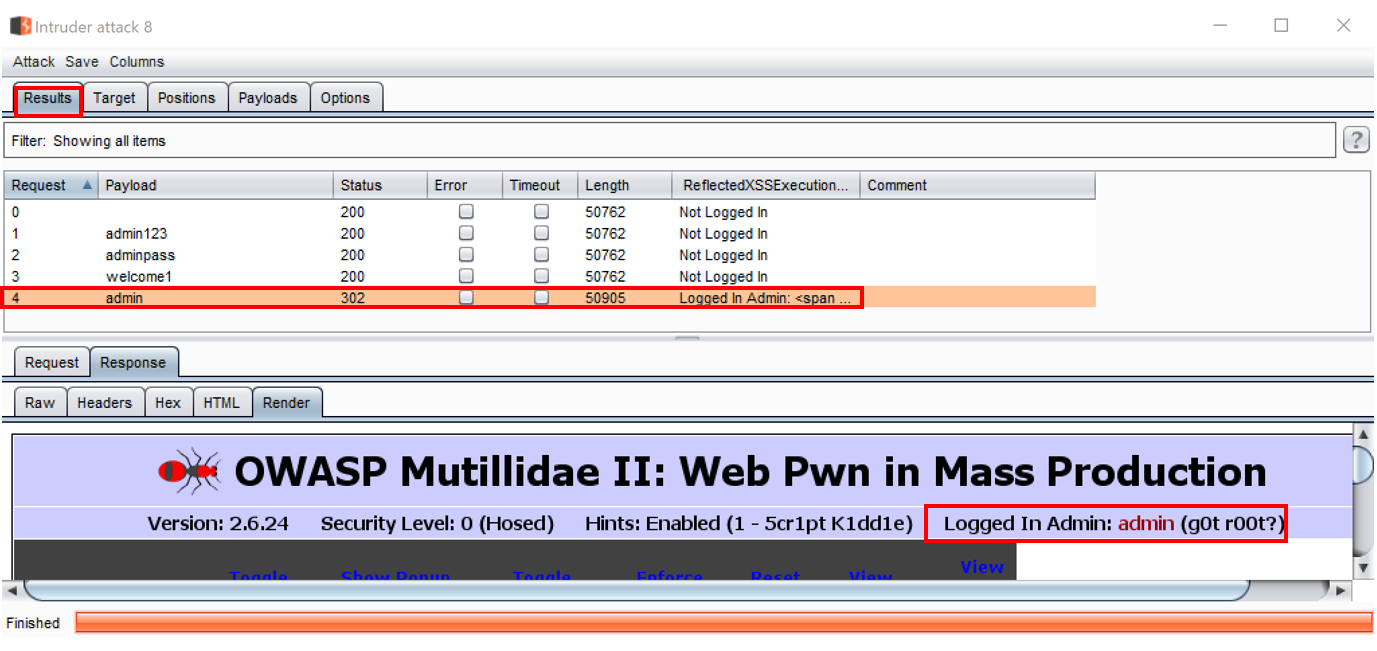 - Select Request 4 within the attack table, and view the Response | Render tab. You should see the message Logged In Admin: admin (g0t r00t?) on the top right-hand side: