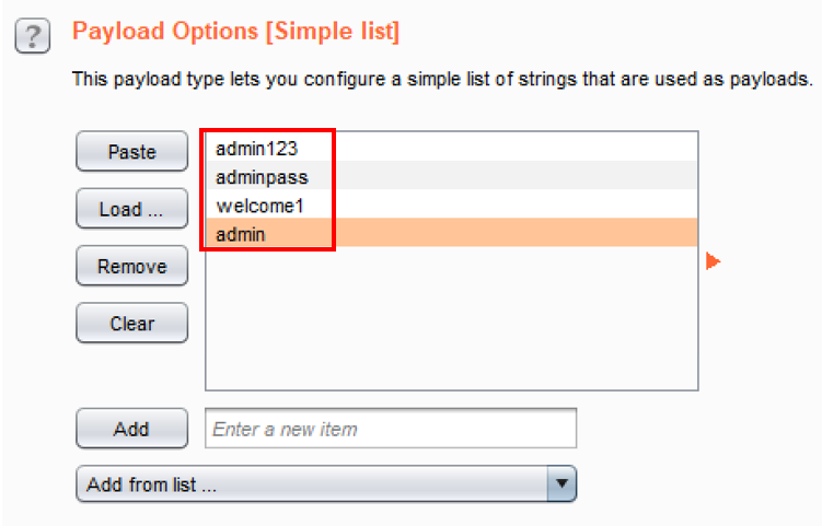 - Add a few more strings, such as adminpass, welcome1, and, finally, admin to the payload-listing box: