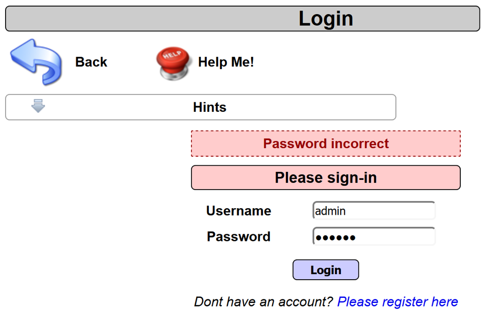- At the login screen, attempt to login five times with username admin and the wrong password of aaaaaa. Notice the application does not react any differently during the five attempts. The application does not change the error message shown, and the admin account is not locked out. This means the login is probably susceptible to brute-force password-guessing attacks: