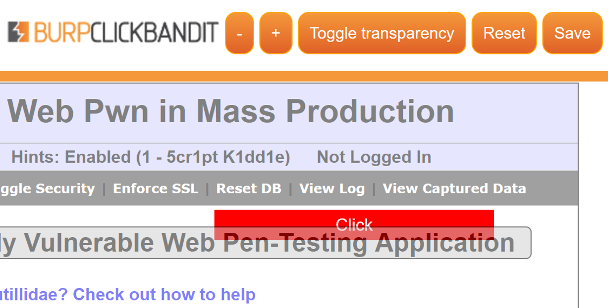 - Start clicking around on the application after it appears. Click available links at the top Mutillidae menu, click available links on the side menu, or browse to pages within Mutillidae. Once you've clicked around, press the Finish button on the Burp Clickbandit menu.