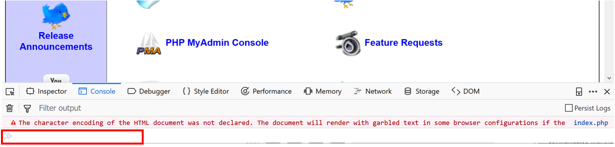 - Return to the Firefox browser, and press F12 to bring up the developer tools. From the developer tools menu, select Console, and look for the prompt at the bottom: