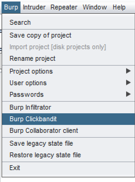 - Switch to Burp, and from the top-level menu, select Burp Clickbandit: