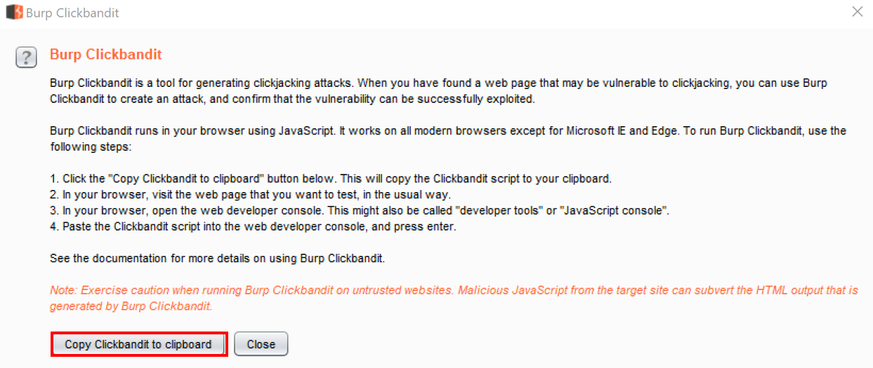 - A pop-up box explains the tool. Click the button entitled Copy Clickbandit to clipboard:
