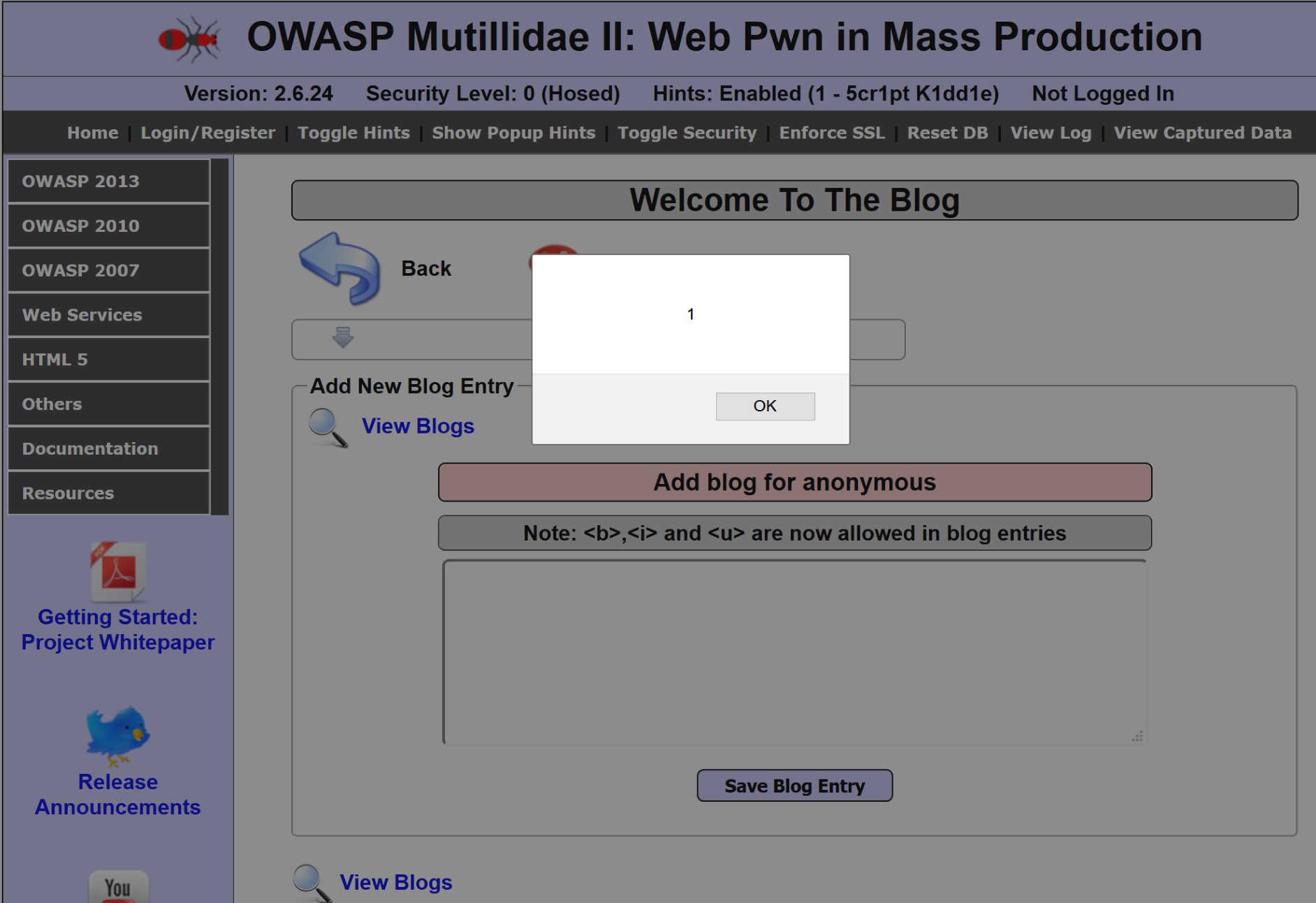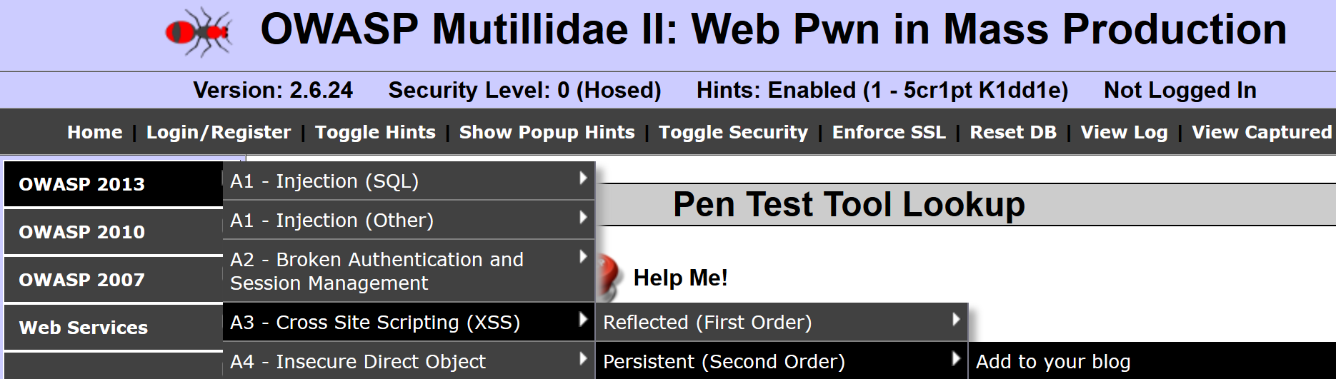 - From the OWASP Mutilliae II menu, select Login by navigating to OWASP 2013 | A3 - Cross Site Scripting (XSS) | Persistent (First Order) | Add to your blog: