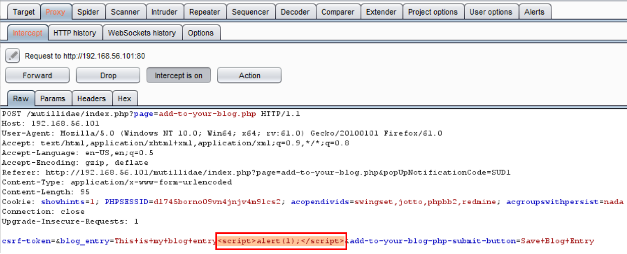 - While Proxy | Interceptor has the request paused, insert the new payload of <script>alert(1);</script> immediately following the verbiage you added to the blog: