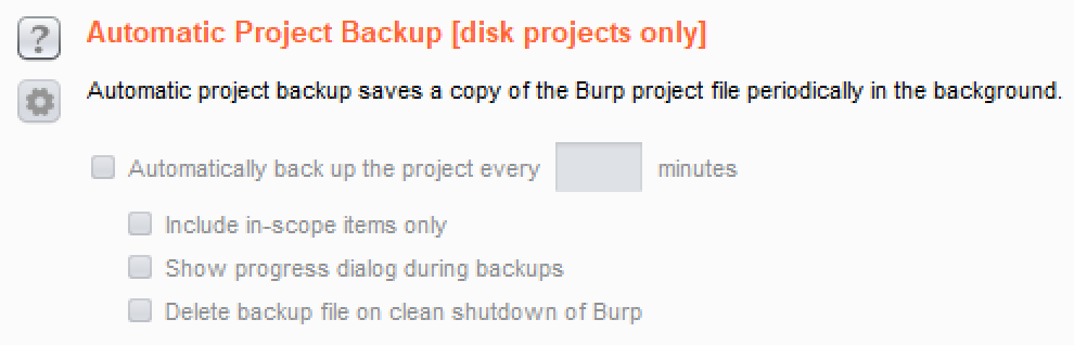 - Automatic Project Backup [disk projects only]: It provides the ability to determine how often backup copies of project files are made. By default, when using Burp Professional, backups are set to occur every 30 minutes: