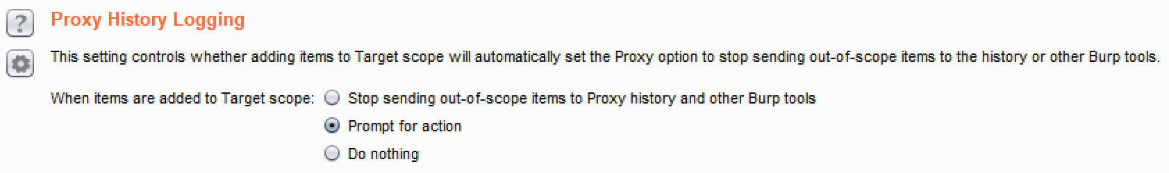 - Proxy History Logging: It provides the ability to customize prompting of out-of-scope items when the target scope changes: