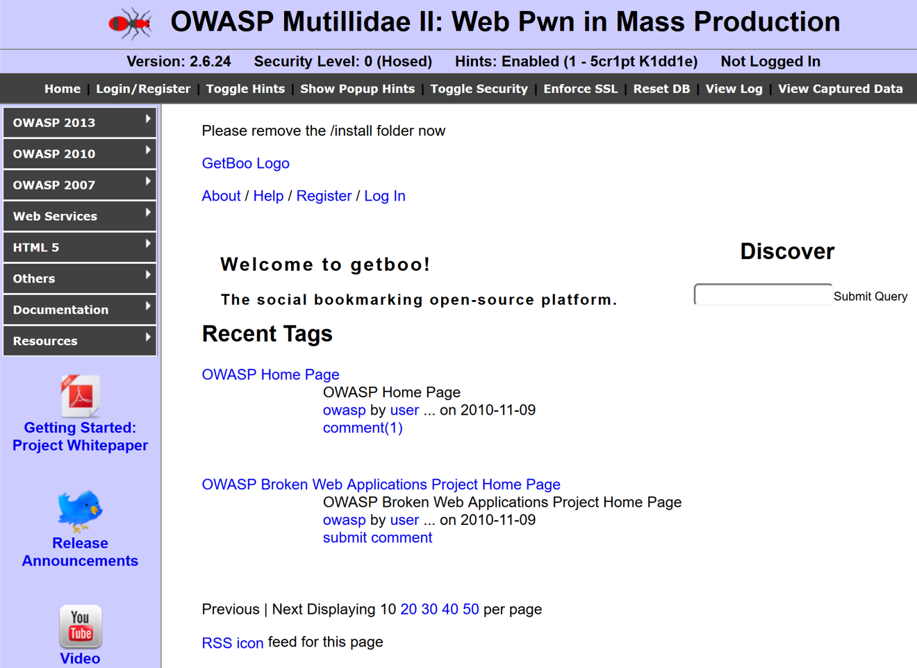 - Return to the Firefox browser, and notice the page loaded is the GetBoo index page within the context of the Mutillidae application!