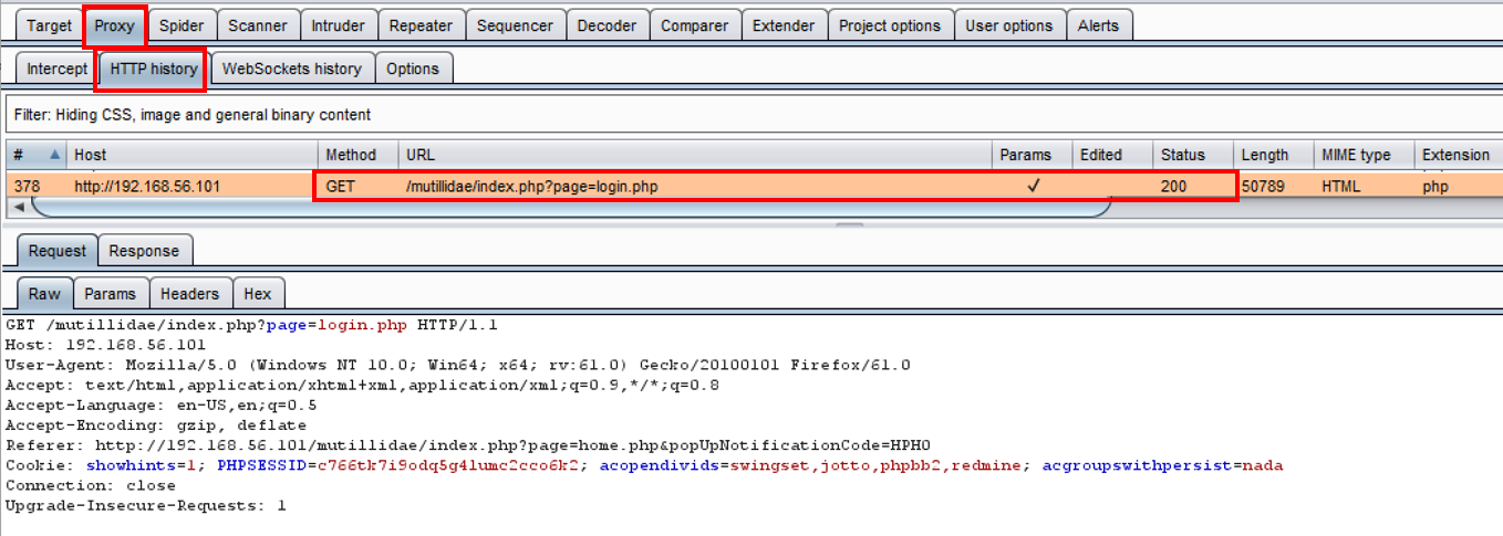 - Find the request you just performed within the Proxy | HTTP history table. Look for the call to the login.php page: