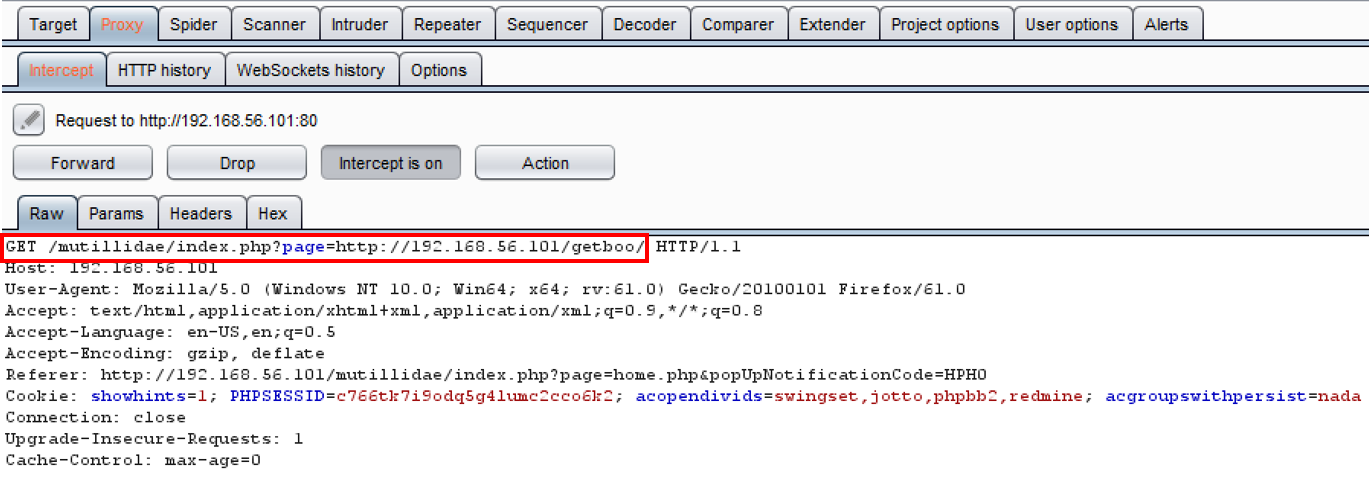 - Now let's manipulate the value of the page parameter from login.php to a URL that is external to the application. Let's use the login page to the GetBoo application. Your URL will be specific to your machine's IP address, so adjust accordingly. The new URL will be http://<your_IP_address>/getboo/