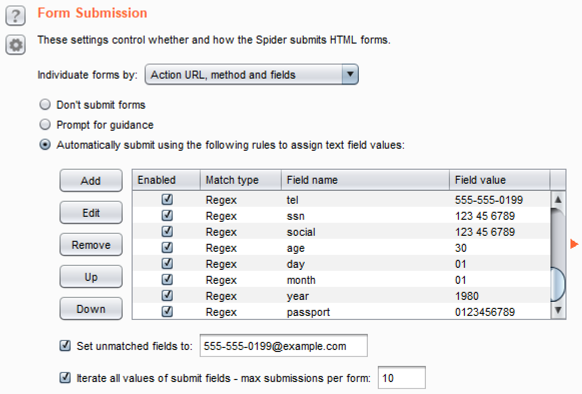 - Form Submission: It provides the ability to determine how Spider interacts with forms. Several options are available including ignore, prompt for guidance, submit with default values found in the table provided, or use an arbitrary value (for example, 555-555-0199@example.com):