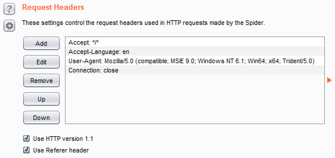 - Request Headers: It provides the ability to modify the way the HTTP requests look originating from Burp Spider. For example, a tester can modify the user agent to have Spider look like a mobile phone: