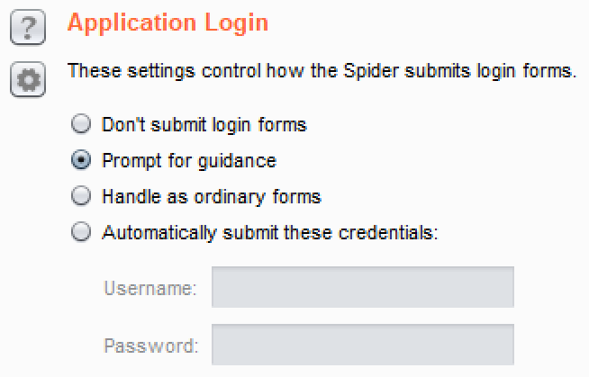 - Application Login: It provides the ability to determine how Spider interacts with login forms. Several options are available, including ignore, prompt for guidance, submit as standard form submission, or use credentials provided in text boxes: