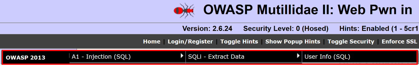 - Navigate to the User Info page. OWASP 2013 | A1 – Injection (SQL) | SQLi – Extract Data | User Info (SQL):