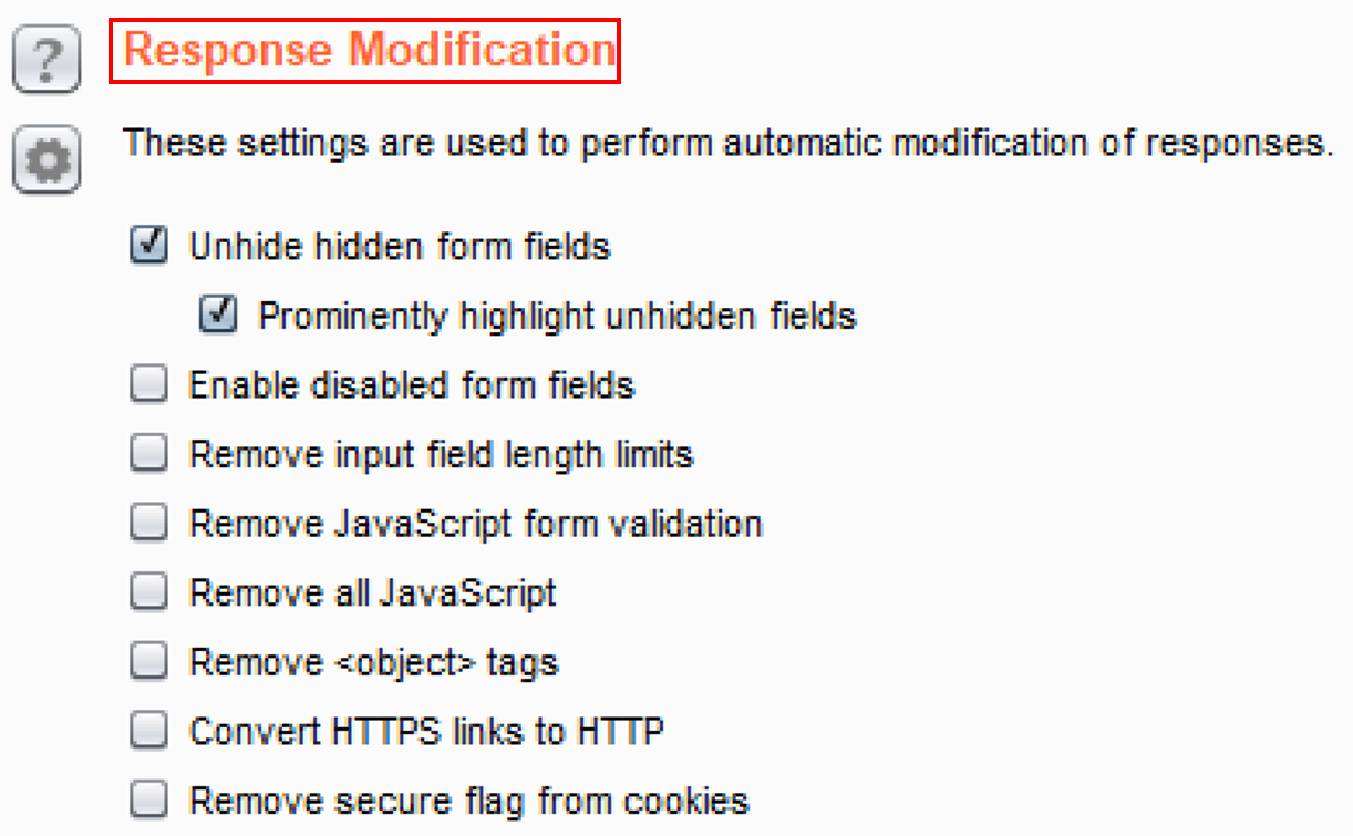 - Switch to Burp's Proxy tab, scroll down to the Response Modification section, and check the boxes for Unhide hidden form fields and Prominently highlight unhidden fields: