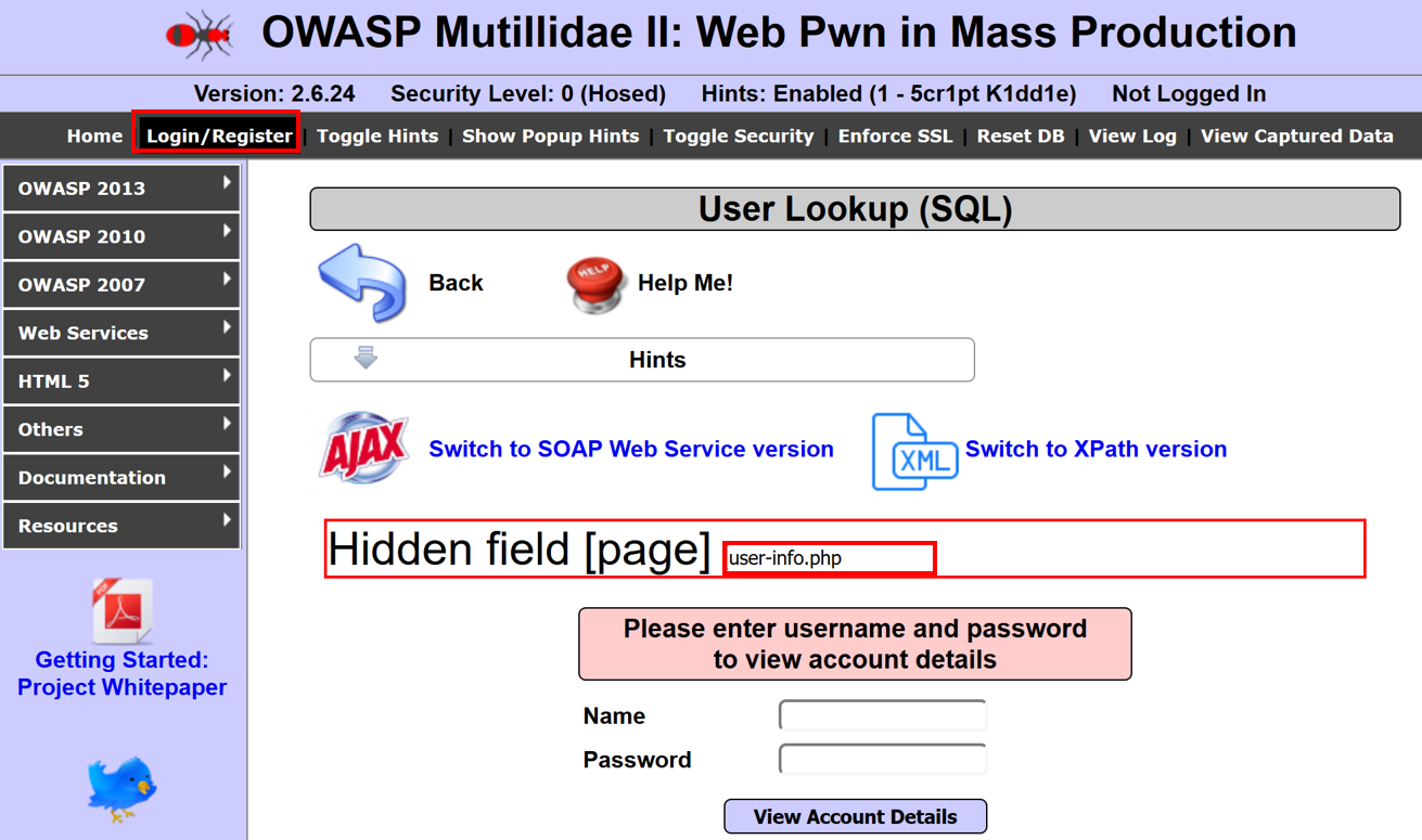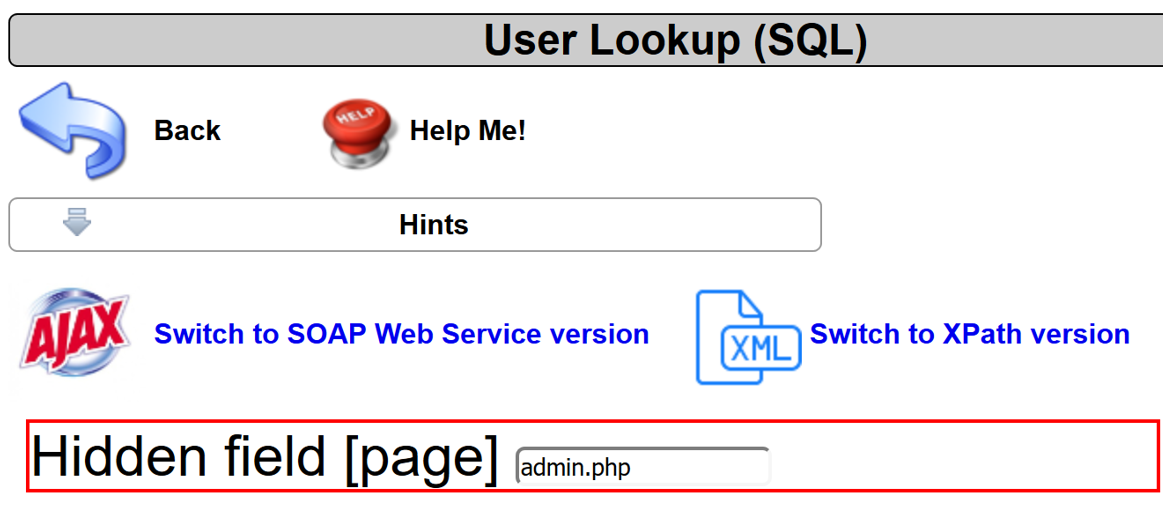 - Let's try to manipulate the value shown, user-info.php, by changing it to admin.php and see how the application reacts. Modify the user-info.php to admin.php within the Hidden field [page] textbox: