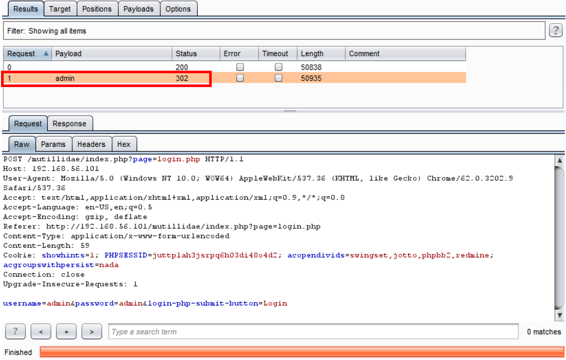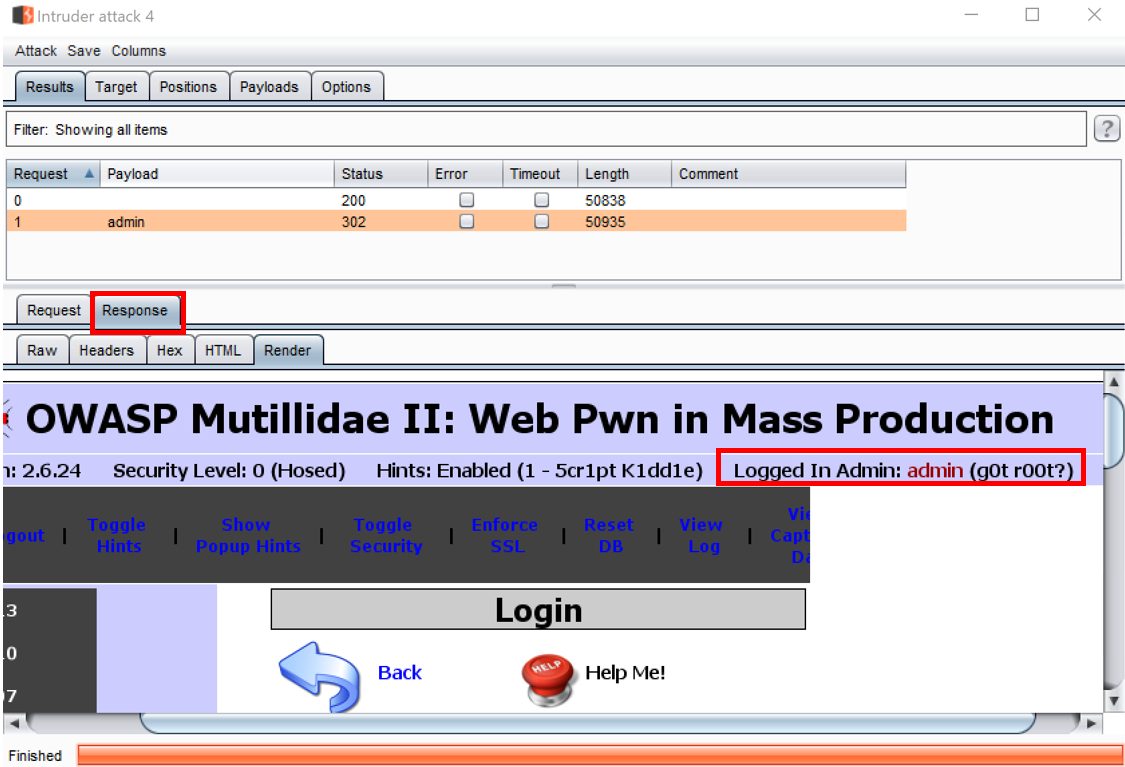 For the purpose of this recipe, we note that the payload of admin in the password parameter produced a status code of 302, which is a redirect. This means we logged into the Mutillidae application successfully: