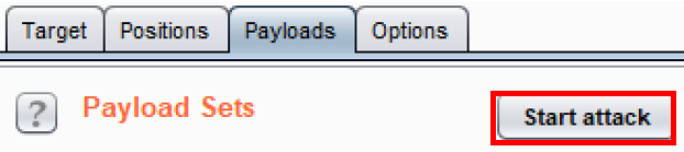 Finally, we are ready to start Intruder. On either the Payloads or the Options tabs, click the Start attack button to begin: