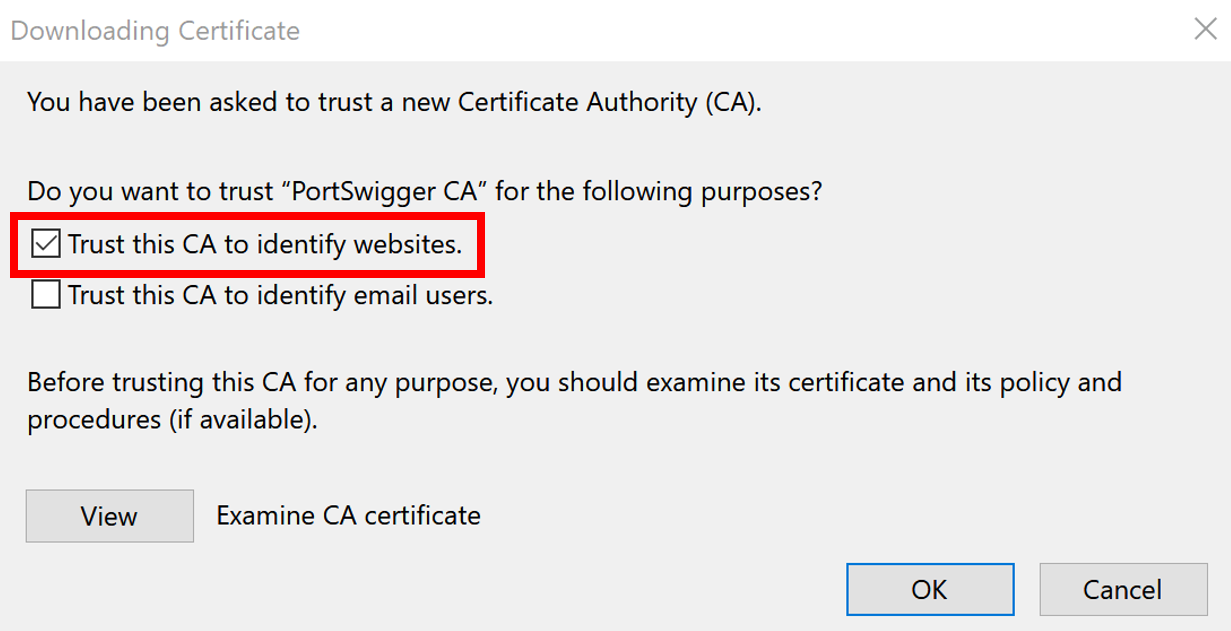 - You will be presented with a dialog box prompting you to download the PortSwigger CA certificate. The file is labeled cacert.der. Download the file to a location on your hard drive.