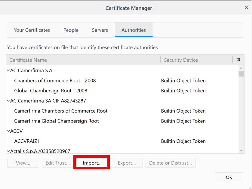 - Select the Authorities tab. Click Import, select the Burp CA certificate file that you previously saved, and click Open:
