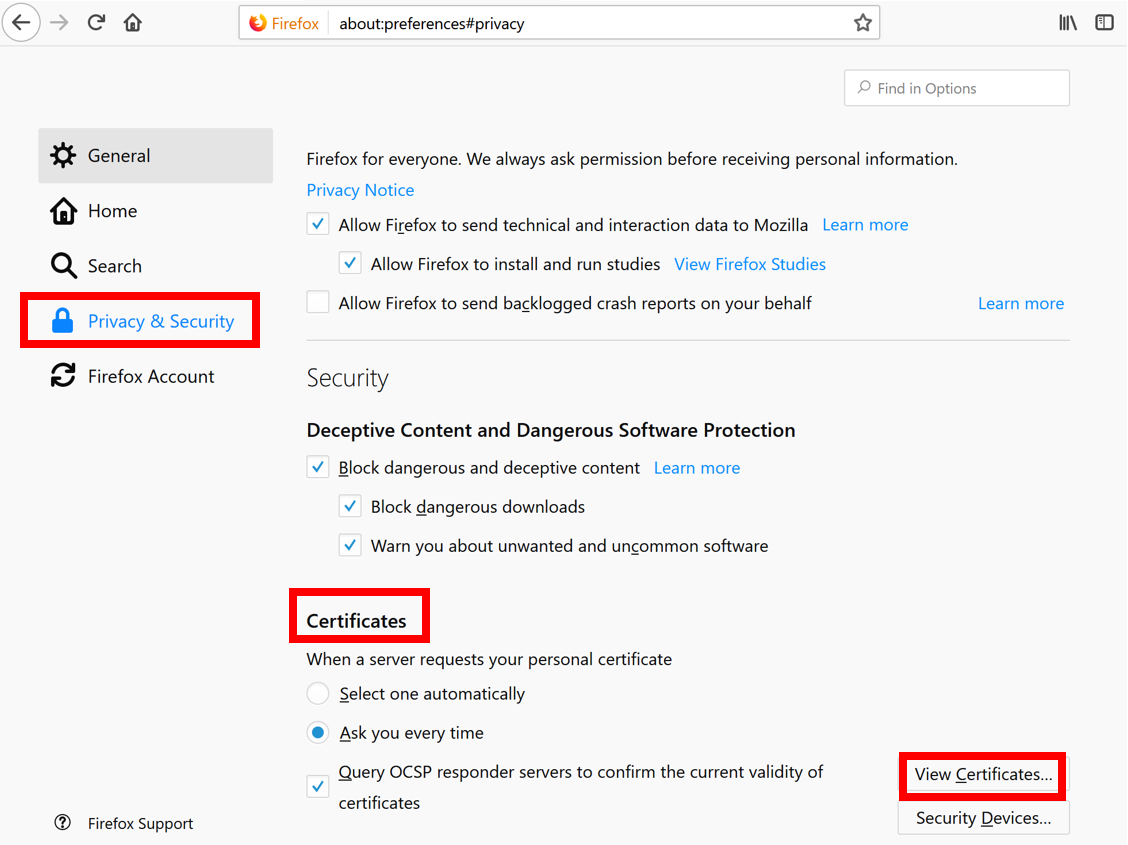 - Click Privacy & Security on the left-hand side, scroll down to Certificates section. Click the View Certificates… button: