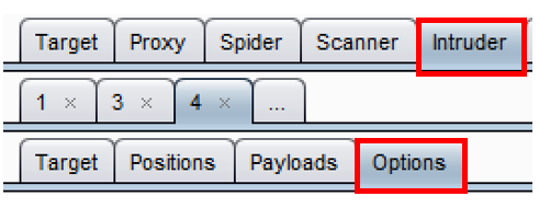 Finally, the Intruder | Options tab provides attack table customizations, particularly related to responses captured such as specific error messages. There are several sections within the Intruder | Options tab, including Request Headers, Request Engine, Attack Results, Grep-Match, Grep-Extract, Grep - Payloads, and Redirections: