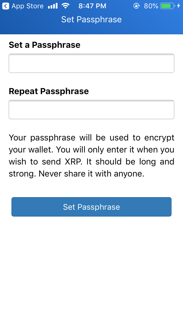 You will be then asked to set a passphrase, like in the following screenshot on the left. You need to provide the passphrase for sending XRP, importing an externally generated account, changing your pin, and so on. Once you set your passphrase, you will be asked to write down your recovery passphrase. If you forget it, you will lose access to the Toast wallet unless you can provide the recovery passphrase. Make sure you write it down.