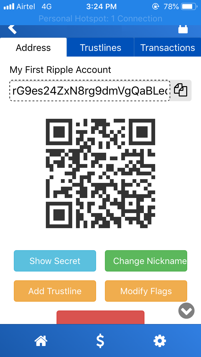 Congratulations! You've successfully created your first Ripple account. Now, tap on the account's nickname. The long string on your phone's screen below your account's nickname is your public address. When you want to receive funds on your account, you give this address. You can tap the copy button toward the right-hand side of the public identity to copy the full address to your clipboard. The nickname is set only for your reference; it cannot be used as an identity: