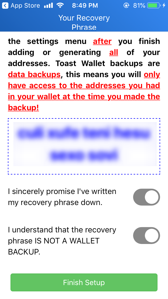If you lose your recovery passphrase, then there is no way to regain access to your account. This is because the Toast wallet doesn't store any of your account data online and hence cannot provide you with recovery assistance. Once you have noted down the recovery passphrase, press the Finish Setup button, as shown in the following screenshot on the right: