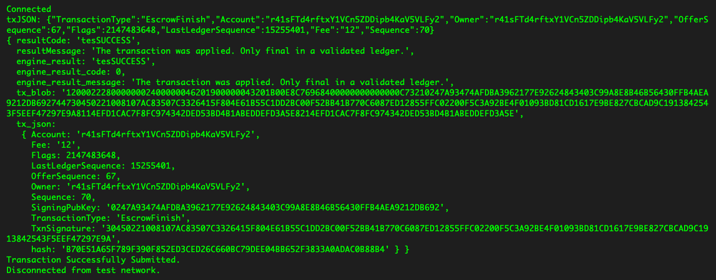 - Prepare transaction: Here, we define the owner account that created the escrow and the sequence parameter we received from escrow creation.