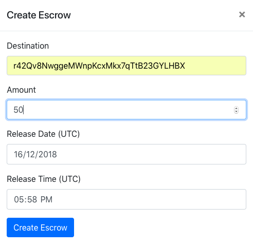 You can create the escrow by specifying the destination address, amount, and release time in UTC as shown in the following screenshot. Please select a nearby time, because you can release the escrow only when the time has lapsed: