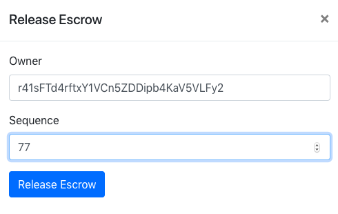 Finally, you can release the escrow using the release escrow form by inputting the sequence and the address of the owner of the escrow as shown in the following screenshot: