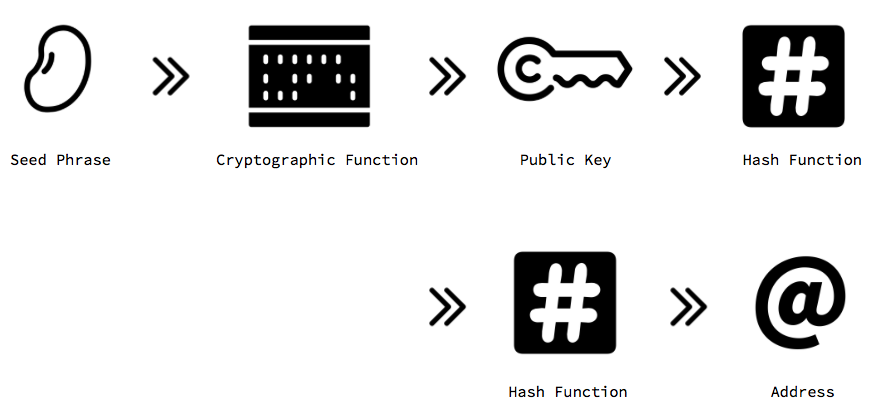 Now, A349 is our identity on the Ripple network. The key point to note here is that if you lose your seed, your account is compromised, since every other key can be derived from it. The following image demonstrates how the seed phrase is used to derive the public key and the Ripple identity: