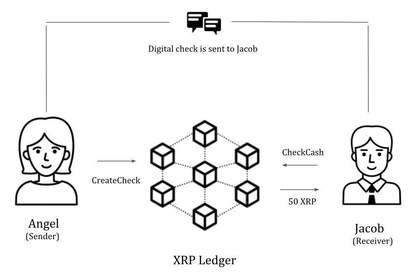 If Angel wants to send Jacob a check of 50 XRP, Angel creates a transaction JSON that specifies the amount to be transferred and Jacob's Ripple address. Later, she signs the transaction using her private key and submits it to the Ripple's network for validation by calling the CheckCreate function. Once the validators confirm the transaction submitted by Angel, the check would be created.