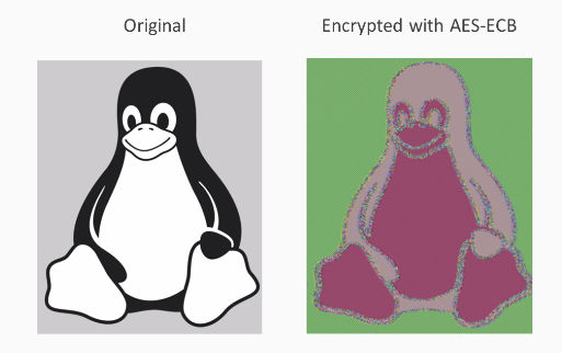 That's not good. You can still see that this is a picture of a penguin, and that's not what most people expect out of encryption. You expect the encryption to conceal the data so attackers looking at the encrypted data can't tell what the message is, and here that property is not present.